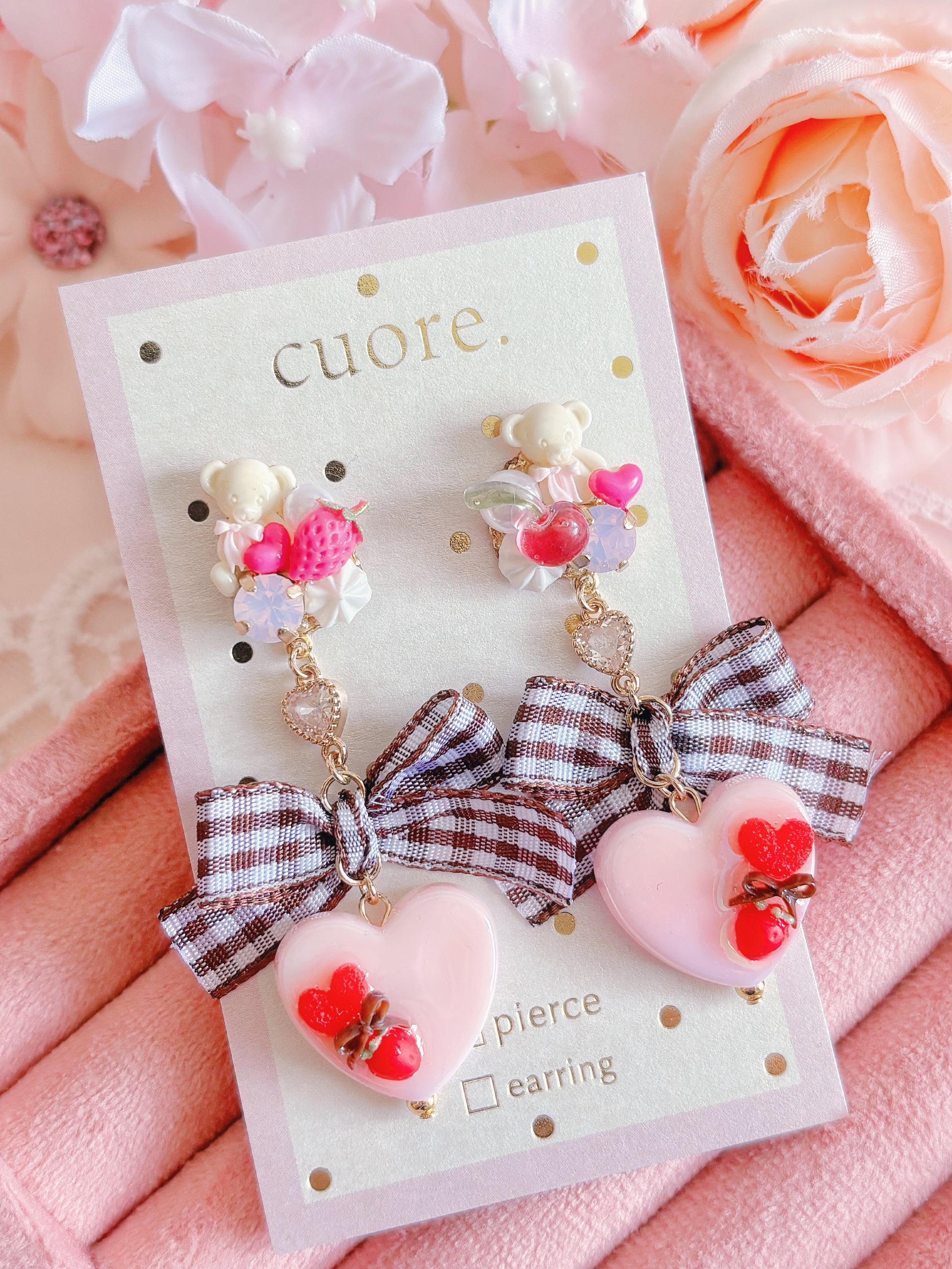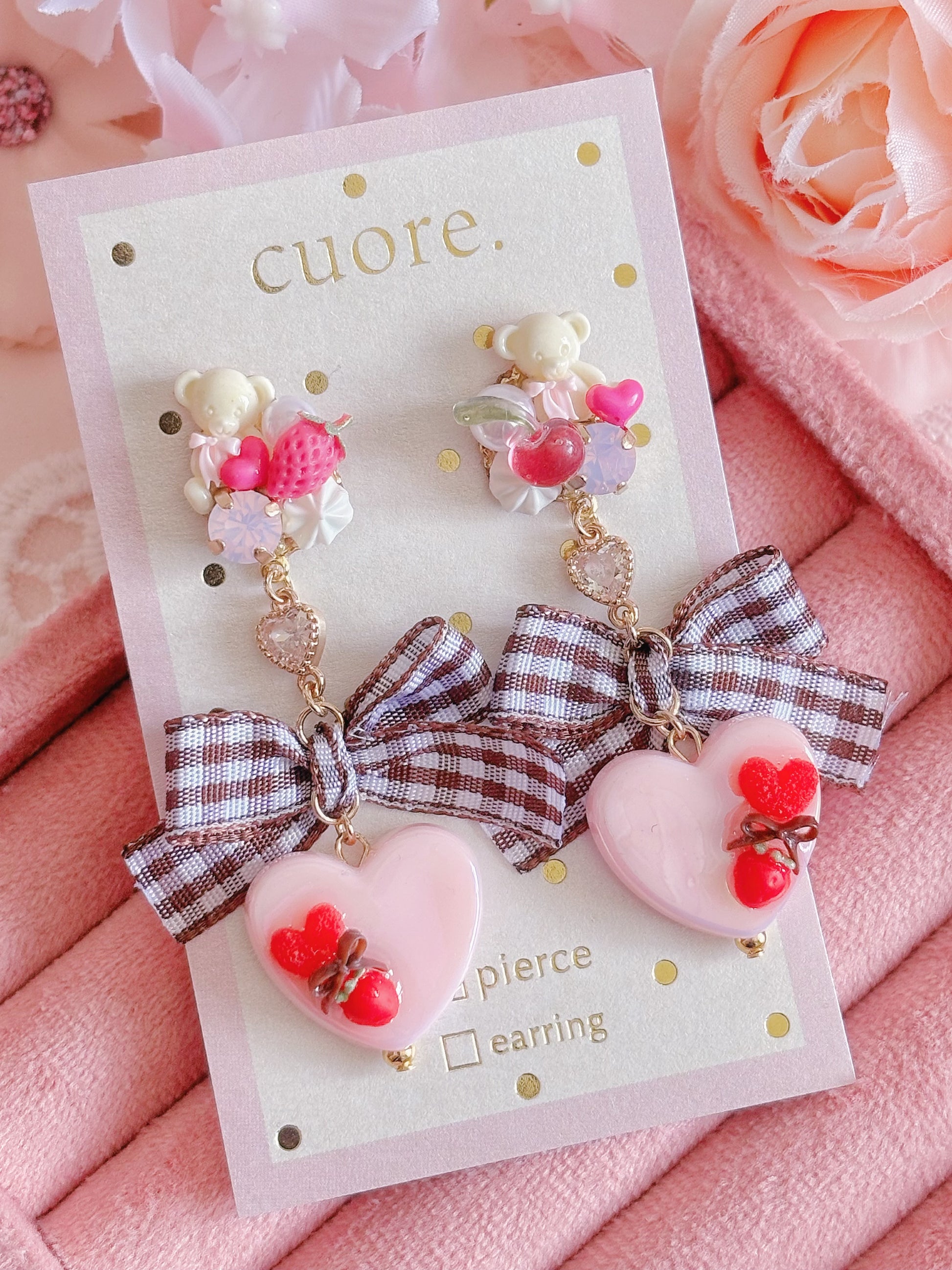 日本手工—Cuore啡色格仔蝴蝶結心心耳環